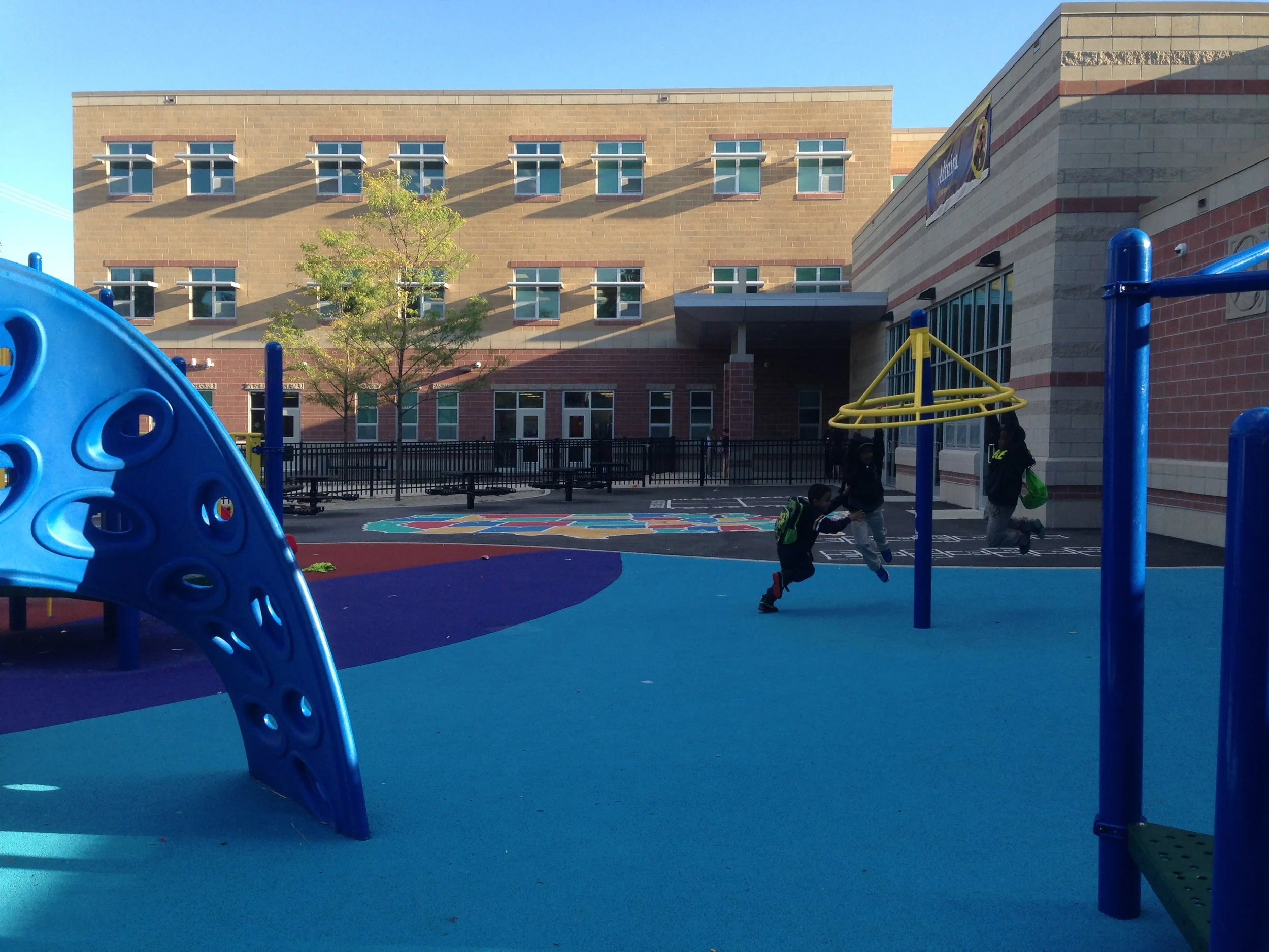 The campus includes age-appropriate outdoor spaces, with separate play areas for Pre-K and grades 1-5, along with a multi-use play field that supports physical education and school activities.