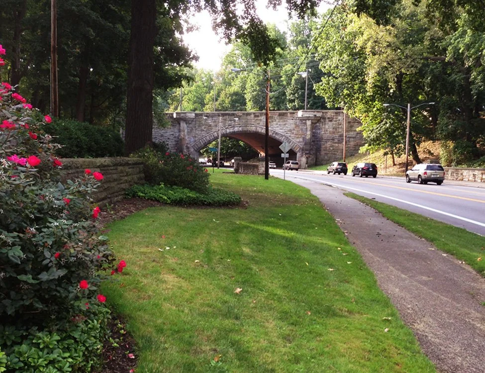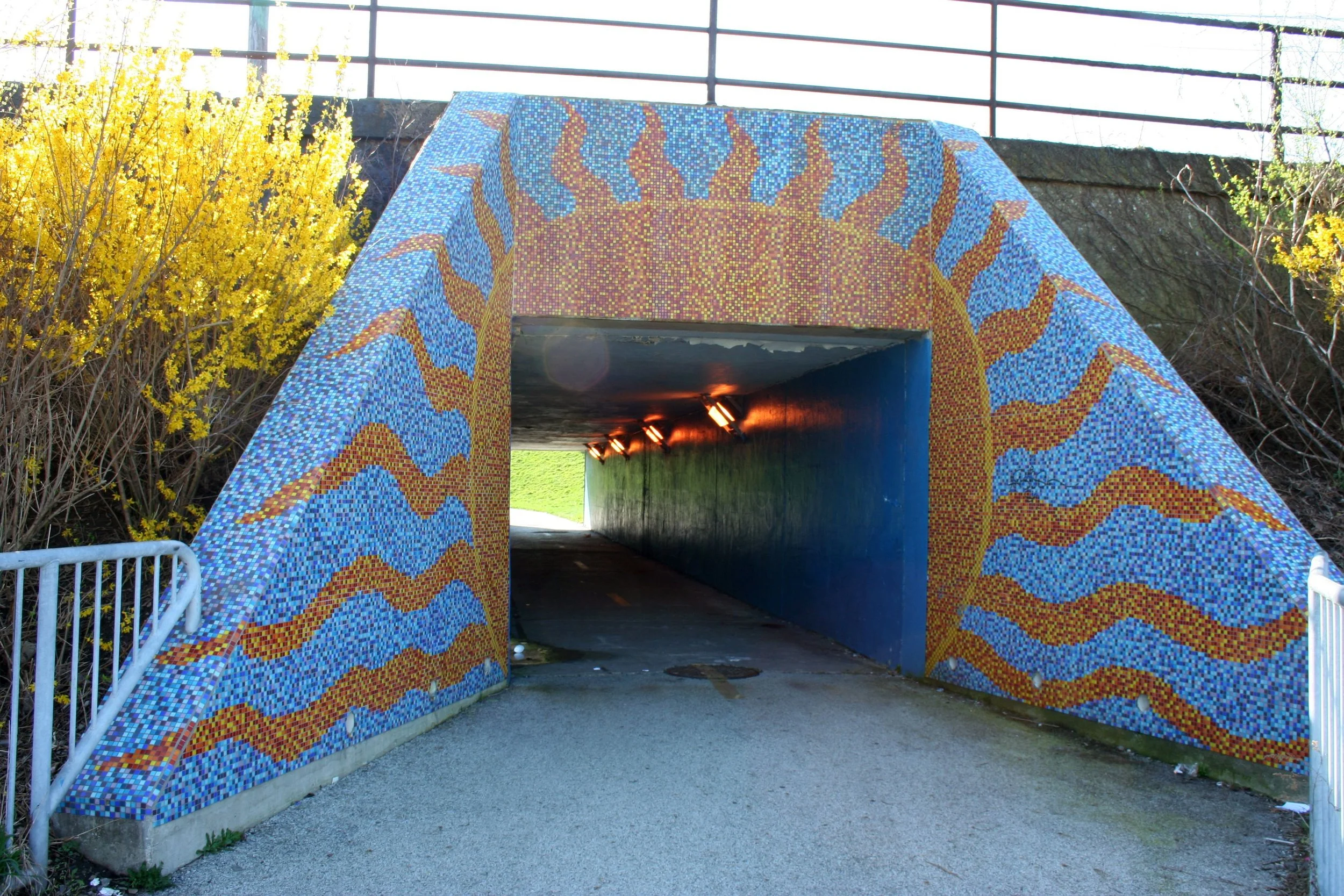 We studied route alternatives and built consensus for the preferred alignment of allpurpose trails and roadway through an extensive community involvement process. Constraints along the route were transformed into assets, such as rehabilitating a derelict pedestrian tunnel into a safe backdrop for public art.