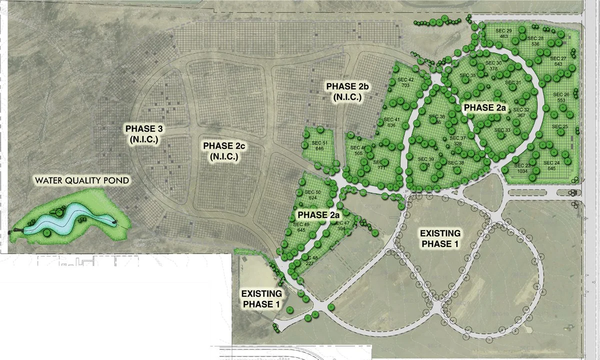 The remainder of Phase 2 is complete and has added over 30,000 new gravesites to the cemetery. A unique feature of the expansion is a 2.5-acre water quality/detention pond.