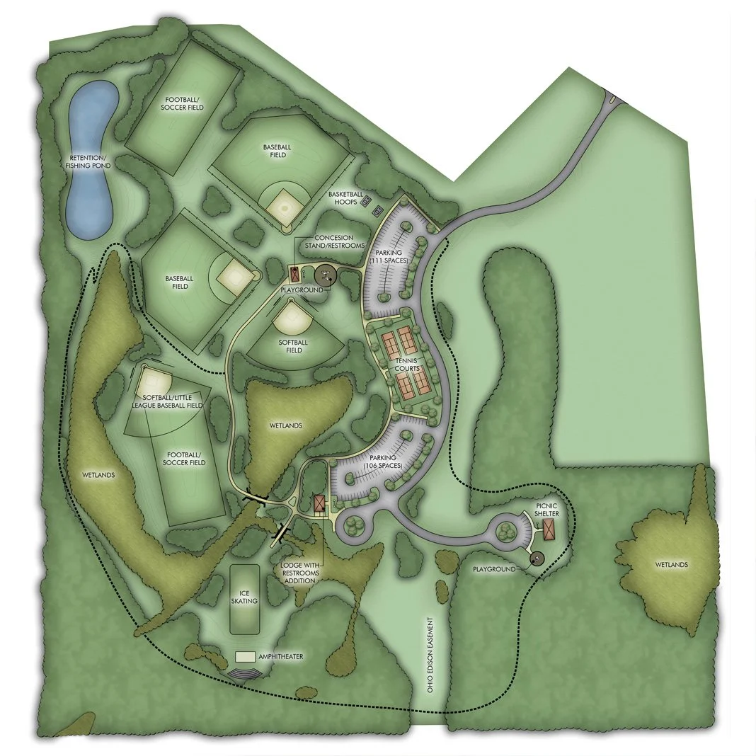 Located on an old gravel quarry donated to Copley Township, this 70-acre site’s abundant wetlands and absence of topsoil made landscape design a challenge. In many places, rock had to be excavated and soil imported to build playfields and parking lots.