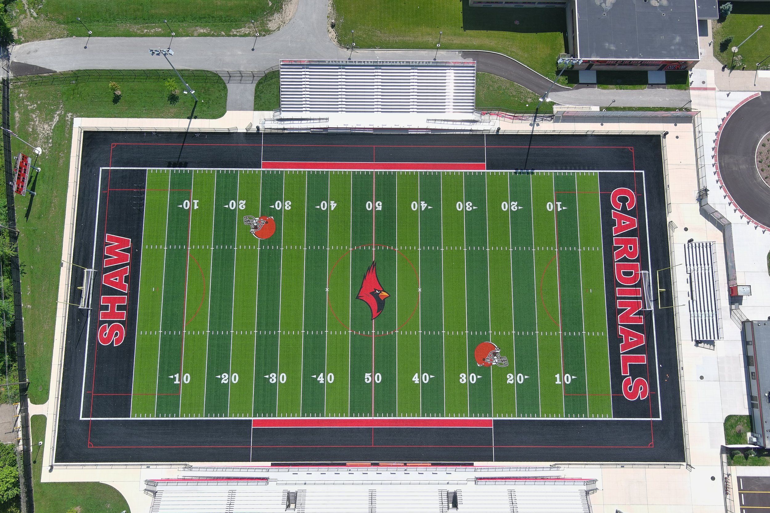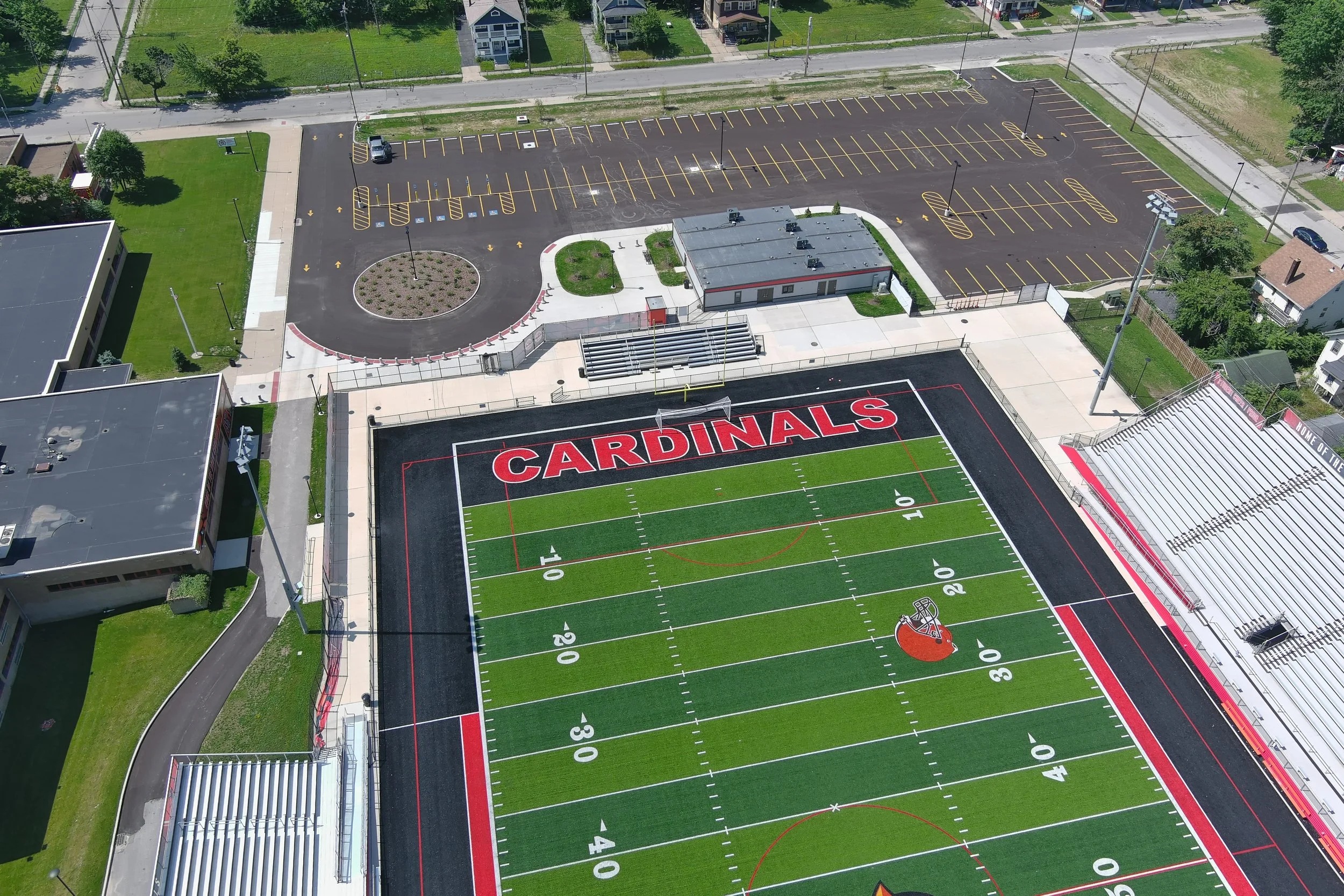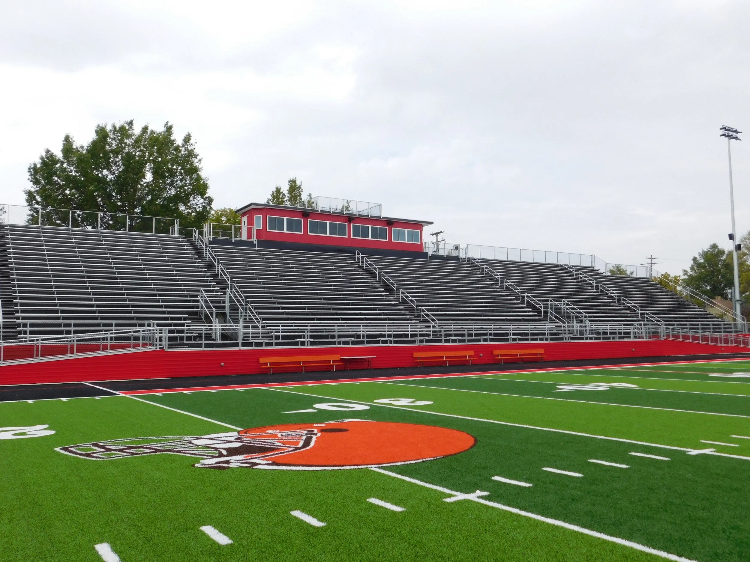 After a brief master planning phase, Behnke proposed a multi-phase plan to design and build the new 4,200-seat stadium, fencing, sidewalks, and practice field in just nine months. The Cleveland Browns, who played two games at Shaw Stadium in the late 1930s, donated the synthetic turf field to the school as part of their “Browns Give Back” program. The rest of the stadium components, such as the stadium lights, bleachers, press box, and ticket booth, were all purchased directly by the school through Sourcewell. A second phase included renovations to the parking lot and the addition of a restroom/locker room building.