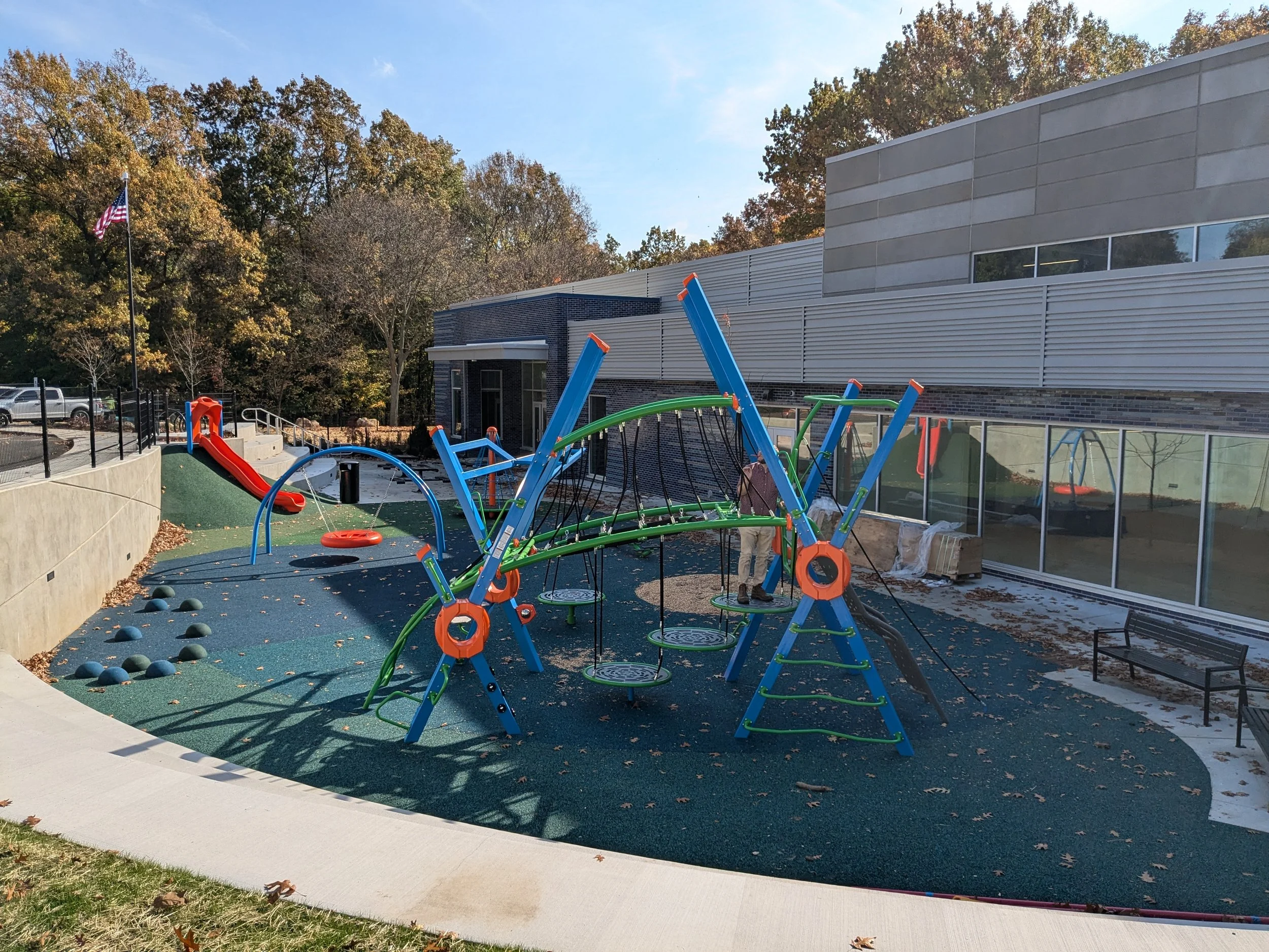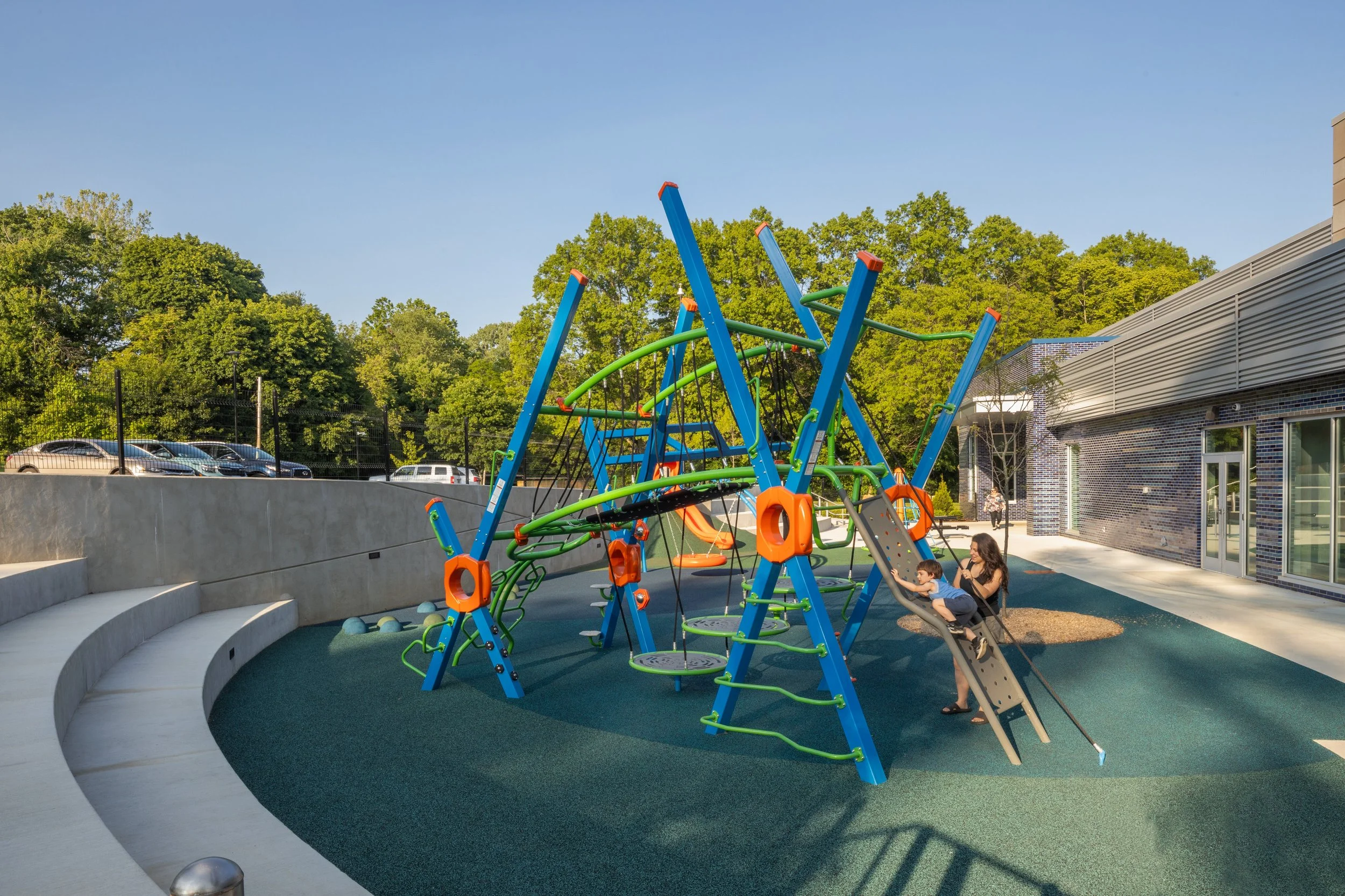 In this new setting, we designed an engaging play area featuring rock walls, hill slides, terraced seating, and climbing elements, all visible from gathering spaces to help parents and children feel connected and safe. Additional parking was carefully integrated into the site while preserving as many of the mature canopy trees as possible.