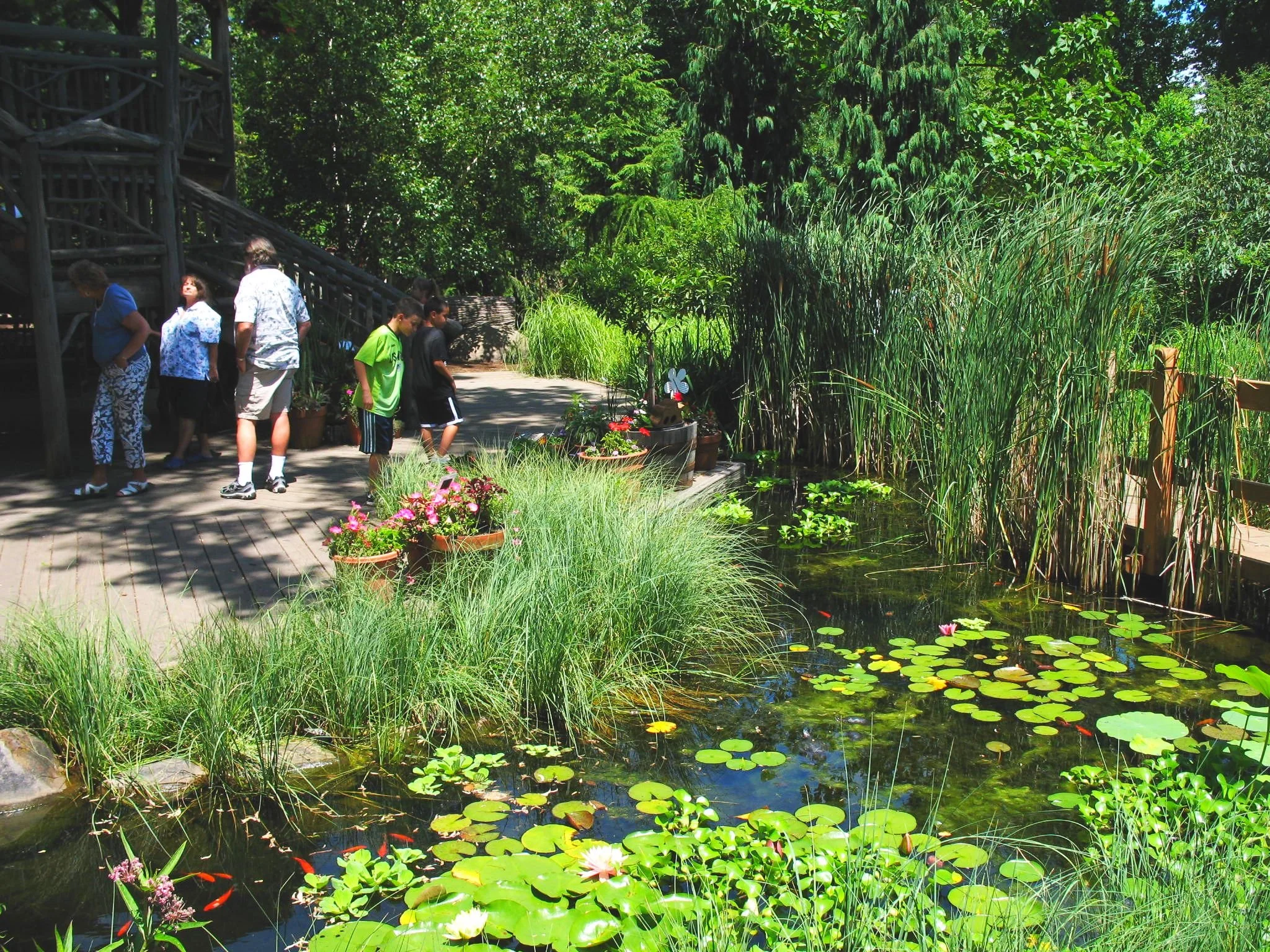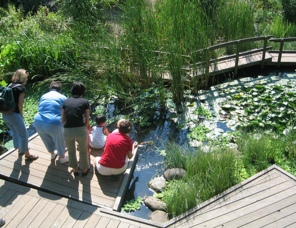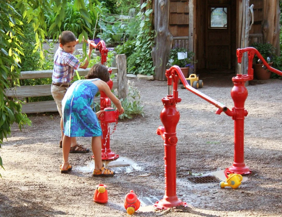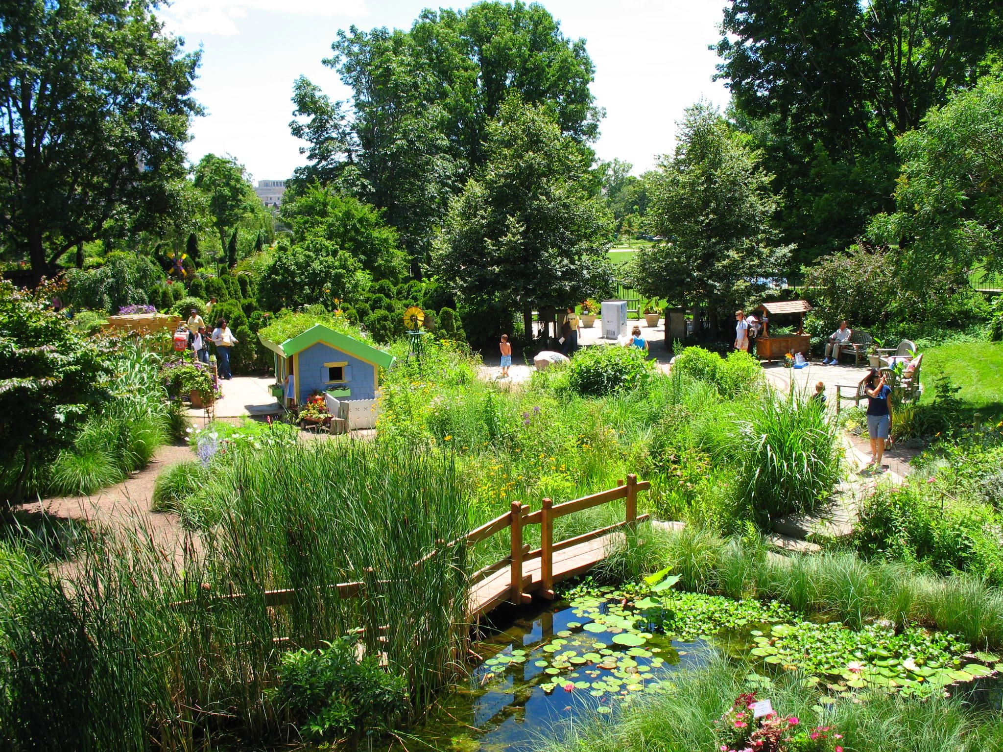 The Hershey Garden teaches children about nature and gardening in a fun, natural environment that encourages social and imaginative play. Landscape elements include a frog pond, stream, peat bog, coppice, tree house, forest, and stone cliff with cave. The garden also features an area for children to pot plants and a small playhouse with green roof.