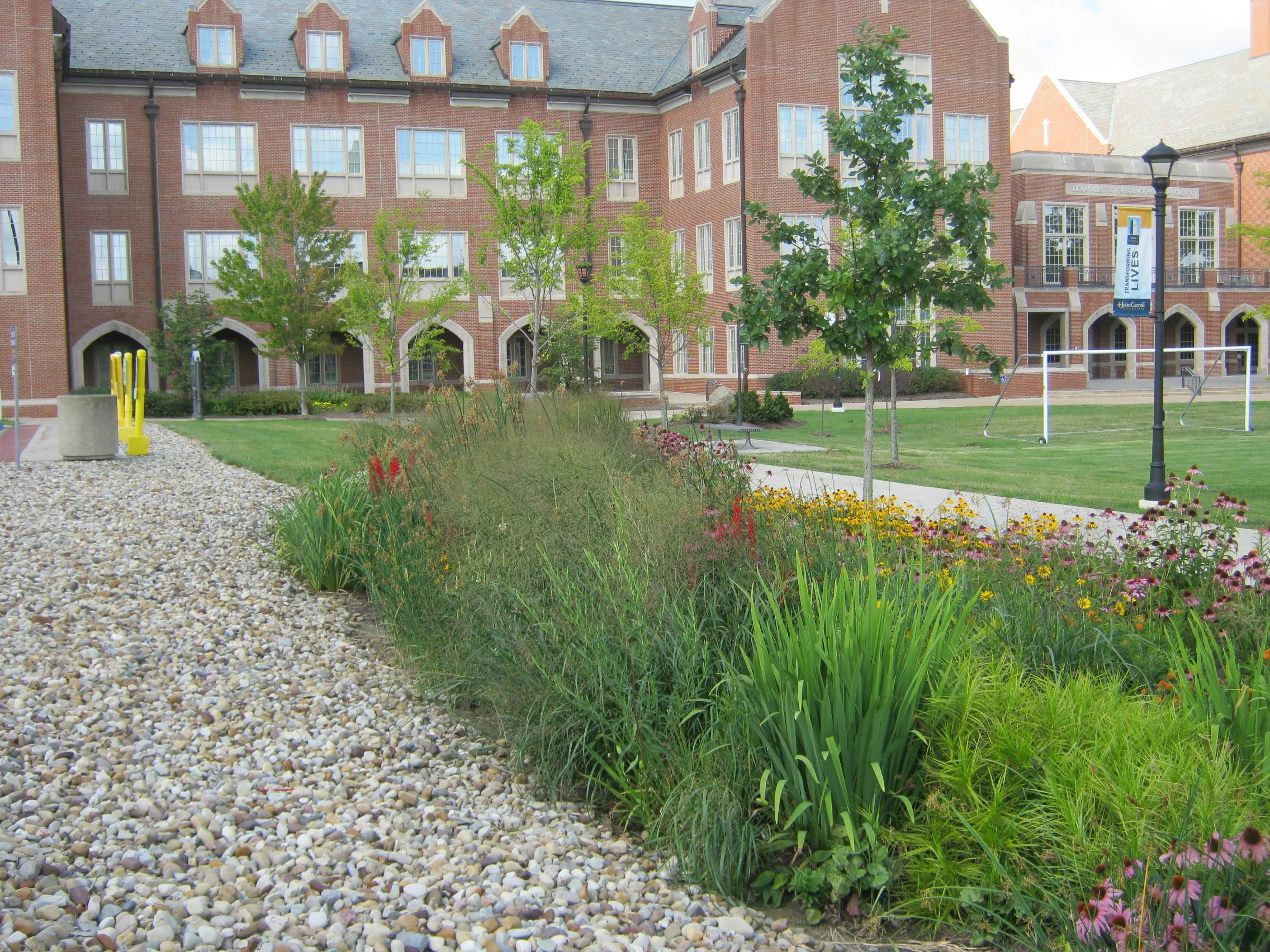 The bioretention areas featured exclusively native plantings selected for long-term performance in the local climate. Together, the quad and surrounding landscape provide year-round visual interest while accommodating athletic use and informal gathering for students, faculty, staff, alumni, and visitors students.