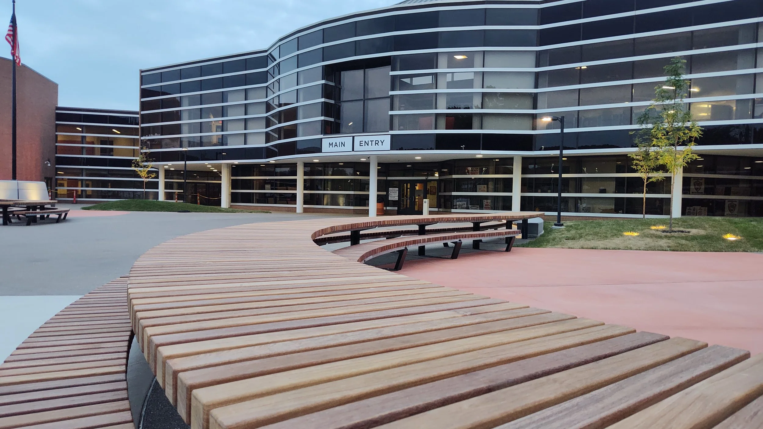 The design includes several intimate outdoor classrooms featuring tiered precast concrete seating with wood slats. Behnke worked with Streetlife to create a custom set of curvilinear picnic tables for the plaza, which have become popular student gathering spaces.
