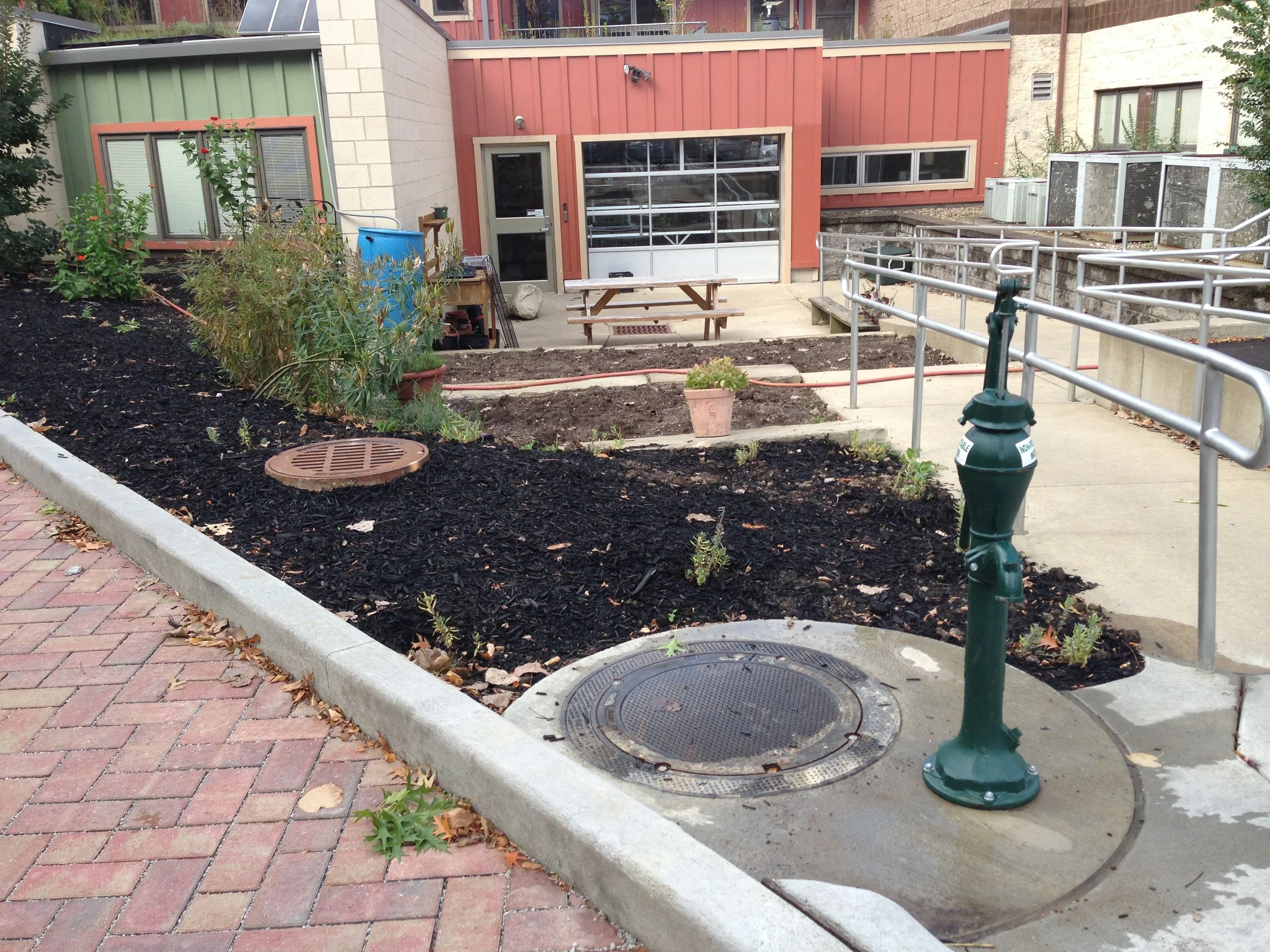 The stormwater learning lab reinforces these principles of sustainable living and green education. Designed to provide hands-on experiences that educate students, staff, parents, and the public about the importance of rainwater management and reuse. The design features a hand pump with an underground rainwater storage cistern, bioretention cells with interpretive signage and water quality/quantity monitoring wells, permeable pavement with monitoring wells, and a clear downspout and decorative trench drain to remind everyone of humans’ rainwater impact on the environment.
