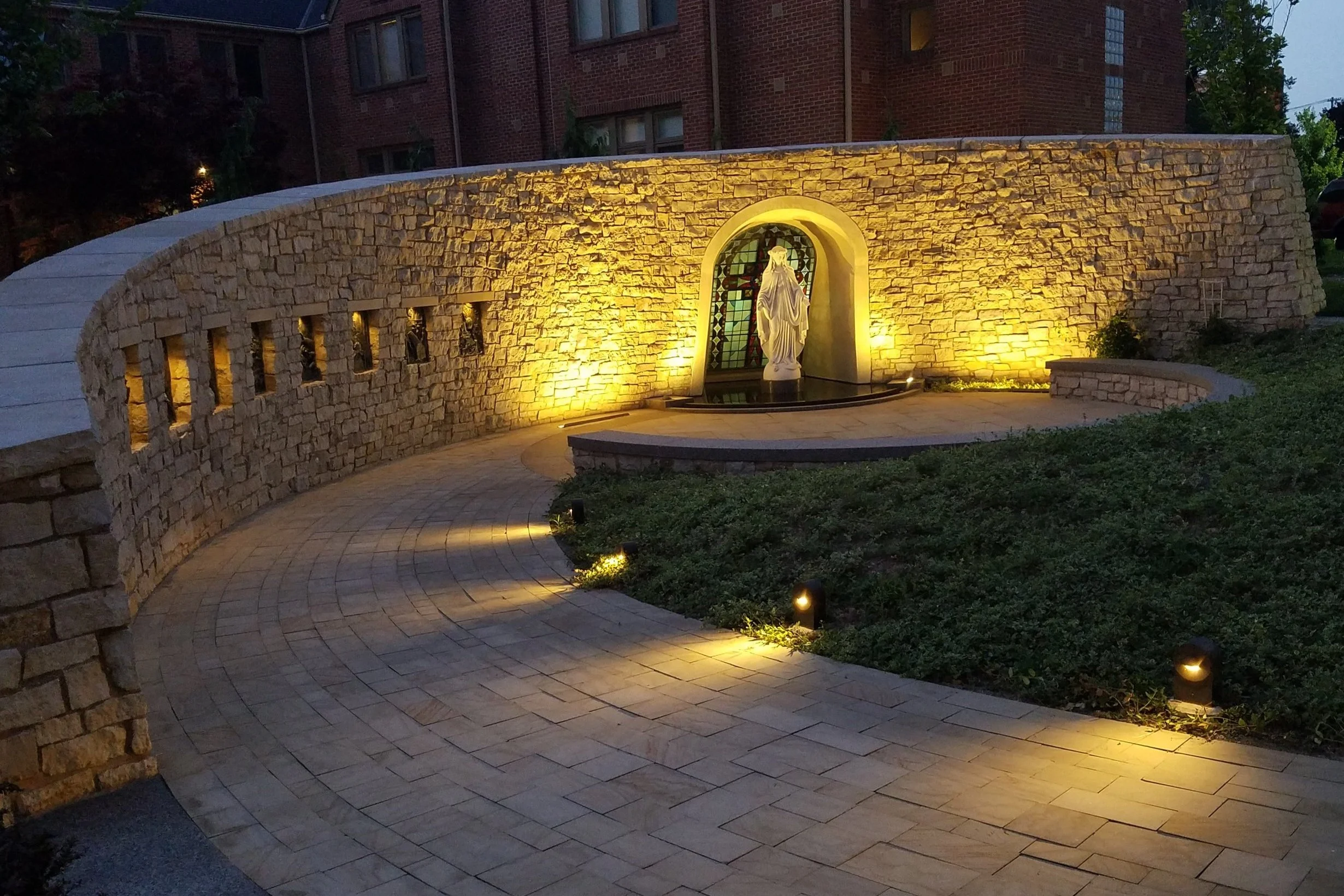 The Grotto serves as the focal point of the space, offering a serene setting for prayer, reflection, and gathering. It also functions as a gateway leading into the Reflection Courtyard.