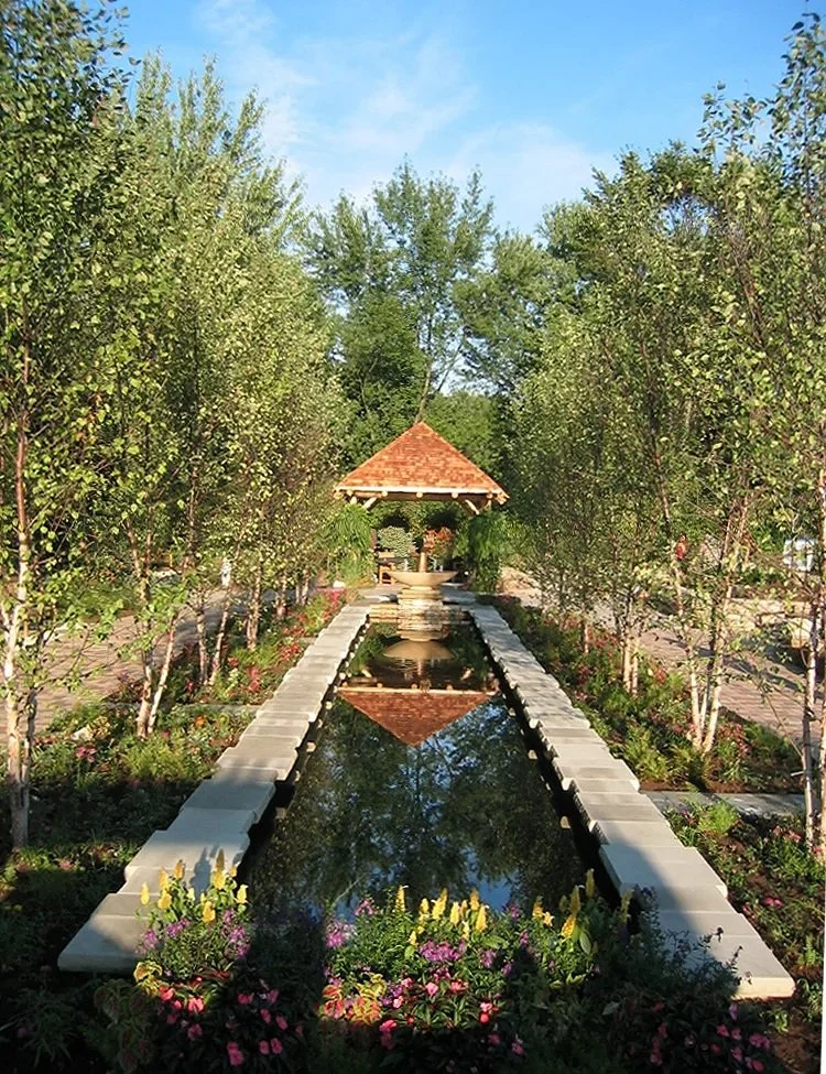 Native plantings that attract birds and butterflies, sandstone walls and boulders, and rustic river birch trees create a naturalized landscape that encourages families to gather, rest, pray, and meditate. The garden’s focal point -- a linear reflecting pool with sculptural fountain -- further defines this garden as a place for healing.
